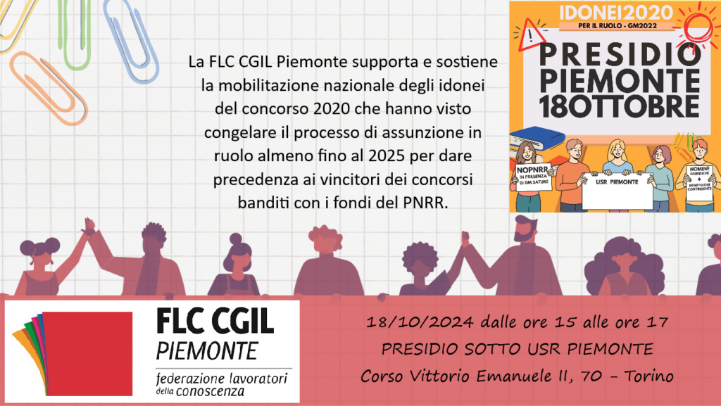 la FLC CGIL Piemonte supporta e sostiene la mobilitazione nazionale degli idonei del concorso 2020 che hanno visto congelare il processo di assunzione in ruolo fino al 2025 per dare precedenza ai vincitori dei concorsi banditi con i fondi PNRR.